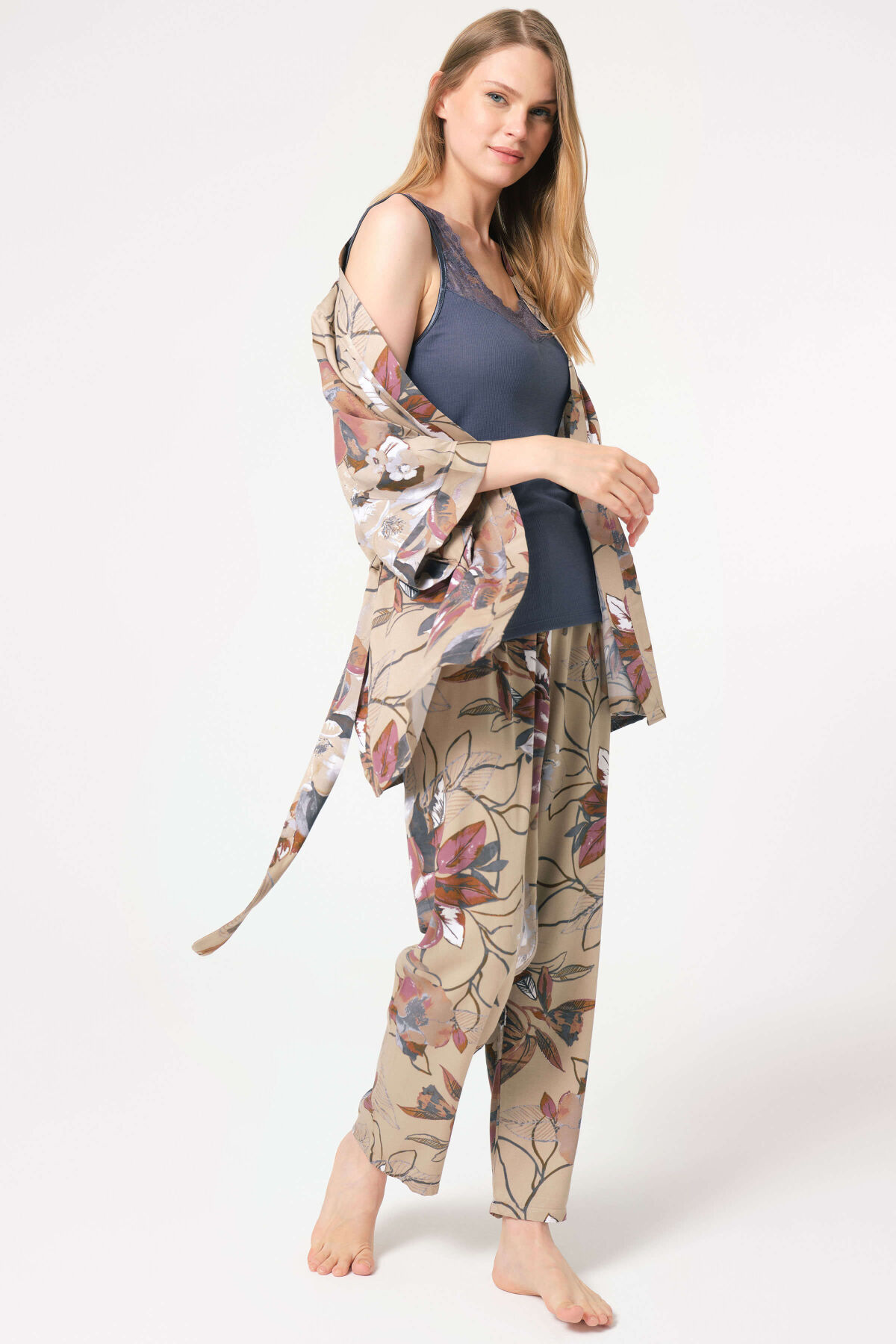 Anıl 5786 Günlük Basic Ev Giyimi İp Askılı V Yaka Viskon Çiçek Desenli Kışlık Örme Normal Bel Uzun Diz_Altı Bağlamalı Uzun Paçalı Dantel Detaylı Pijama Takımı modelimiz