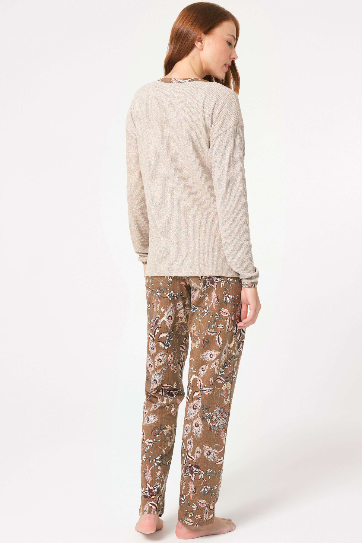 Anıl 5798 Günlük Basic Ev Giyimi Kalın Askılı V Yaka Viskon Çiçek Desenli Kışlık Örme Normal Bel Uzun Diz_Altı Düğmeli Uzun Paçalı Dantel Detaylı Pijama Takımı Sabahlık modelimiz
