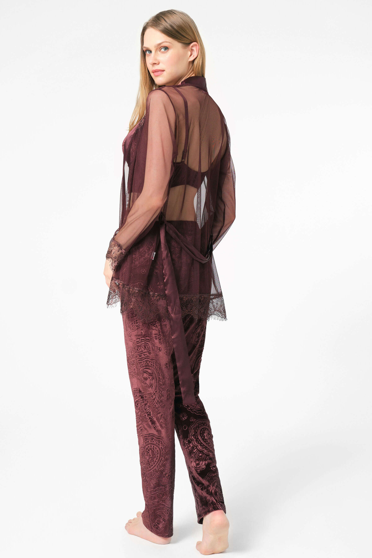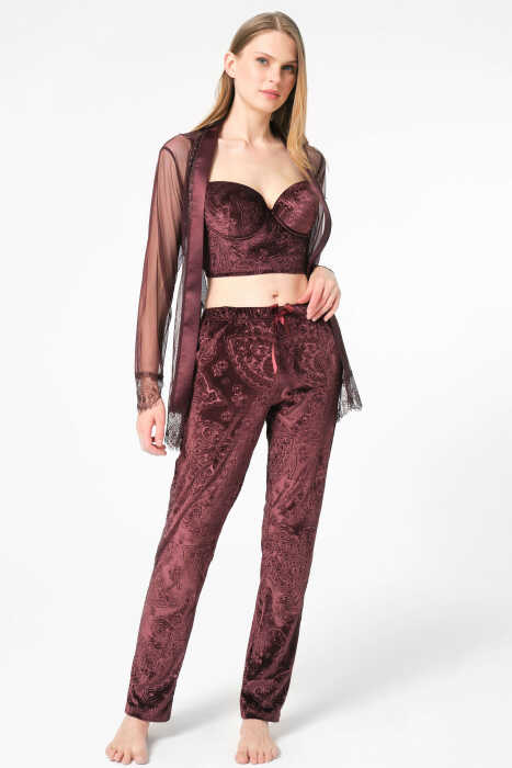 Kısa Ad:Kadın Tül Dantelli Sabahlık Balenli Destekli Dolgulu Çiçek Baskılı Kadife Büstiyer Sütyen ve Pantolon Pijama 3''lü Takım (5682)