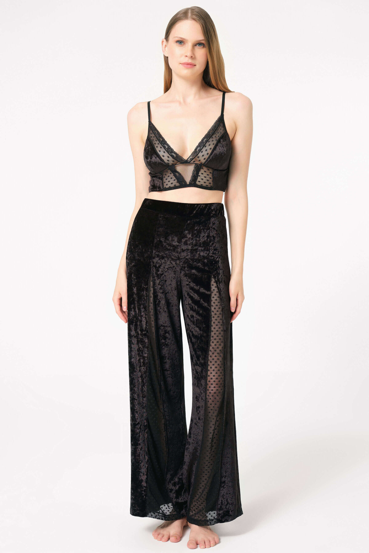 Kısa Ad:Kadın Tüylü Kumaş Sabahlık Balensiz Desteksiz Dolgusuz Dantelli Bralet Sütyen ve Pantolon Pijama 3''lü Takım (5685)